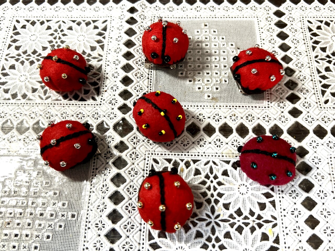 真ん中のテントウムシは、秩父のお土産にいただいたもの。あんまりかわいいので、ありあわせのフェルトとビーズで作りました。
